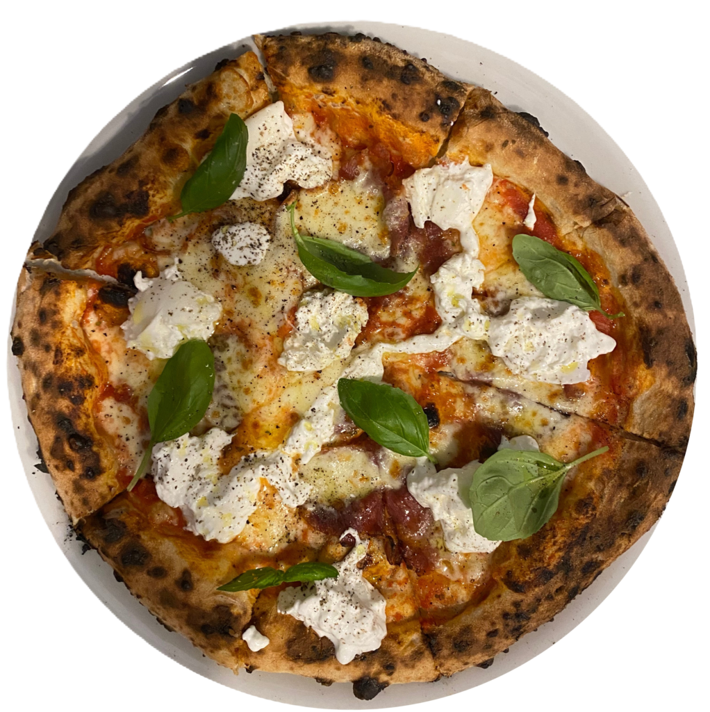 pomodori Pelati, karkówka dojrzewająca Capocollo, śmietankowa mozzarella Burrata, bazylia, oliwa extra vergine, mozzarella Fior di Latte, pieprz45 zł